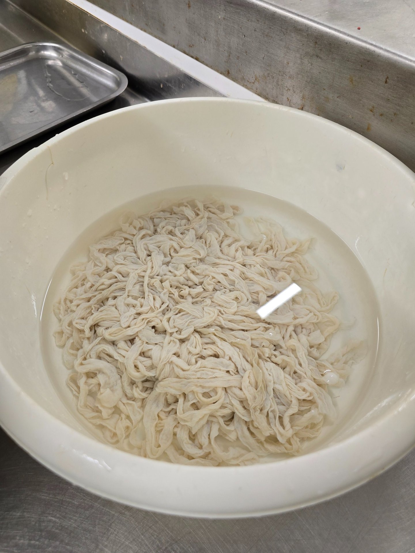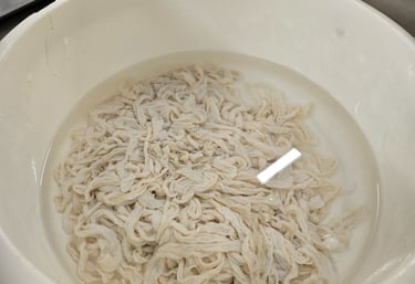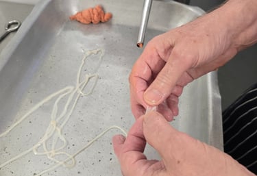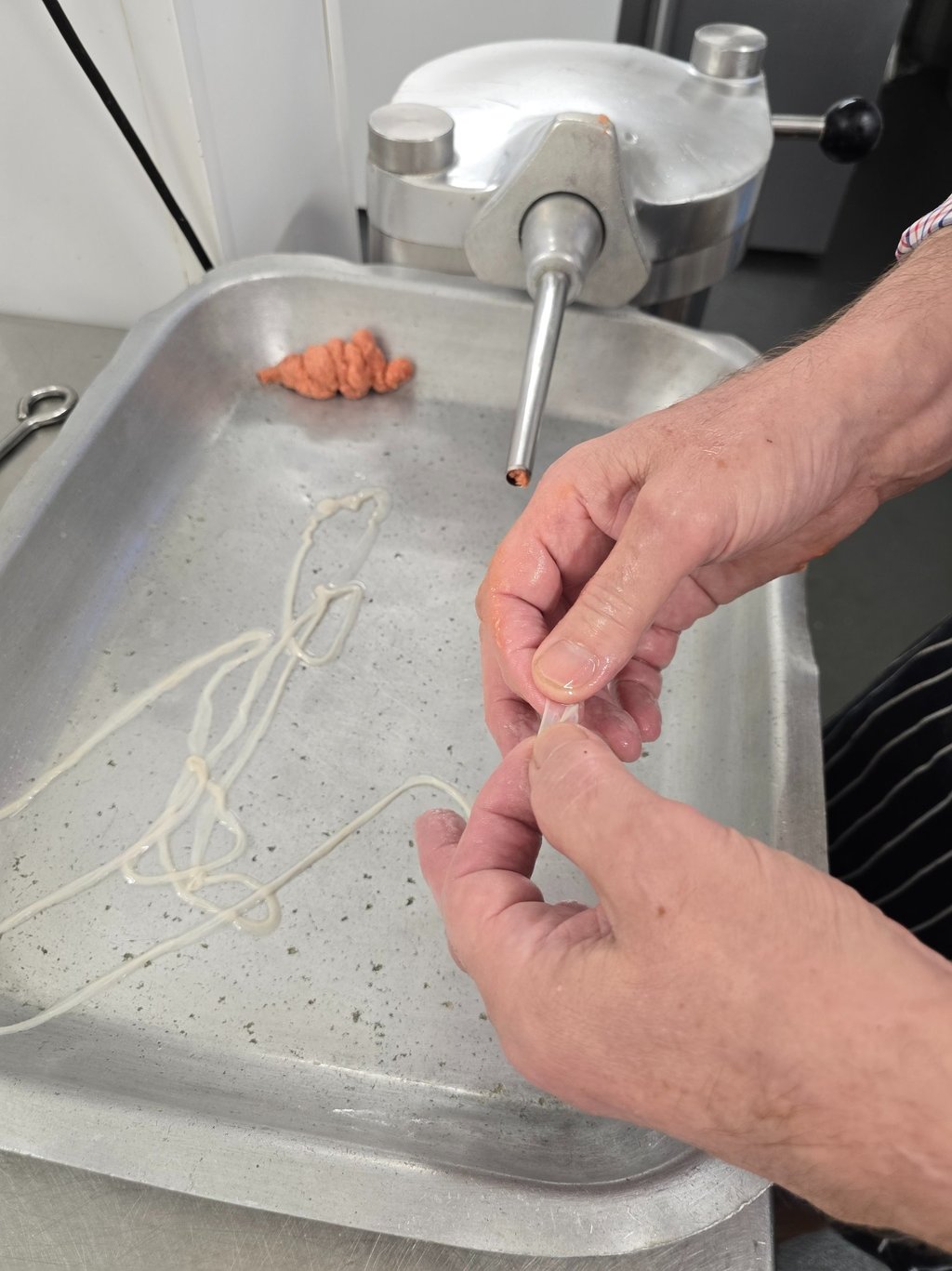 6.Natural skins are threaded onto the sausage 'stuffer.'
